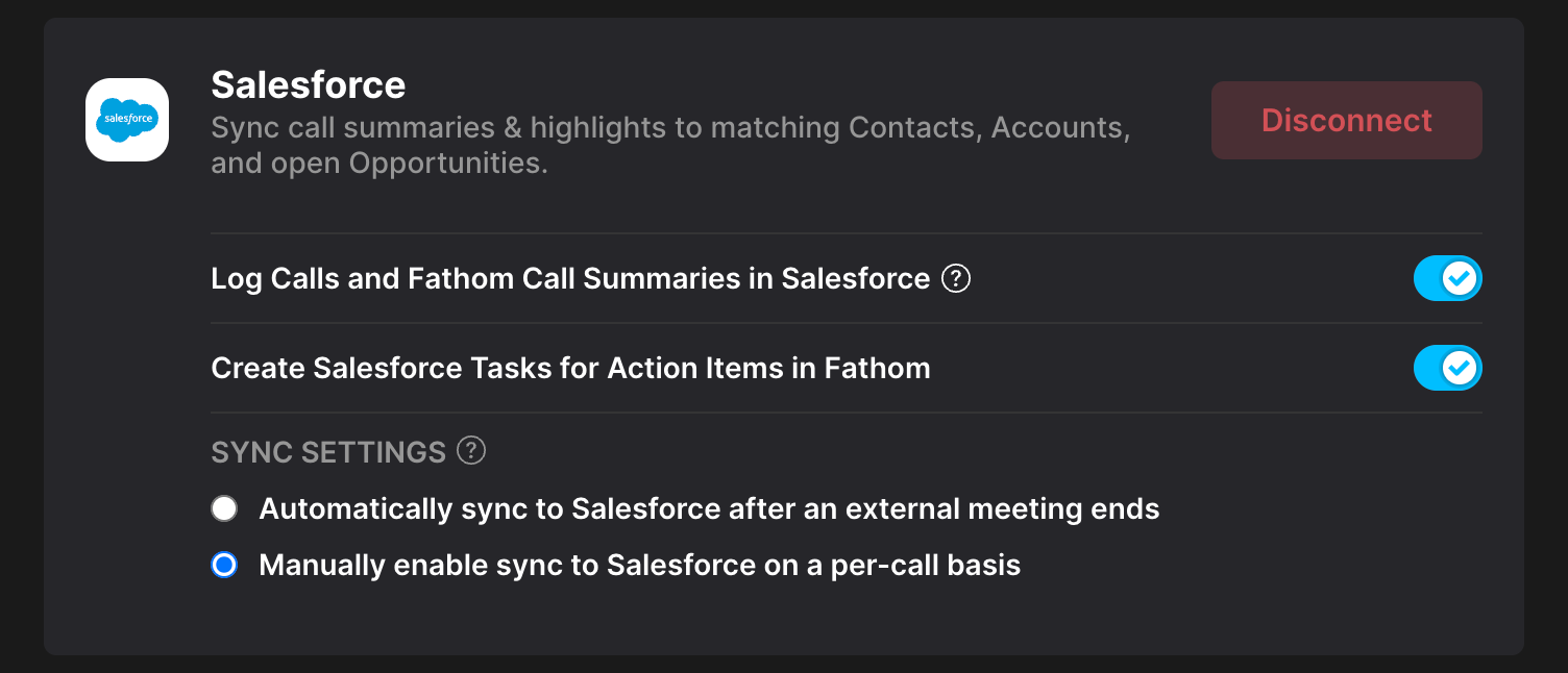 Fathom syncs two main record types to Salesforce: Tasks and Notes.