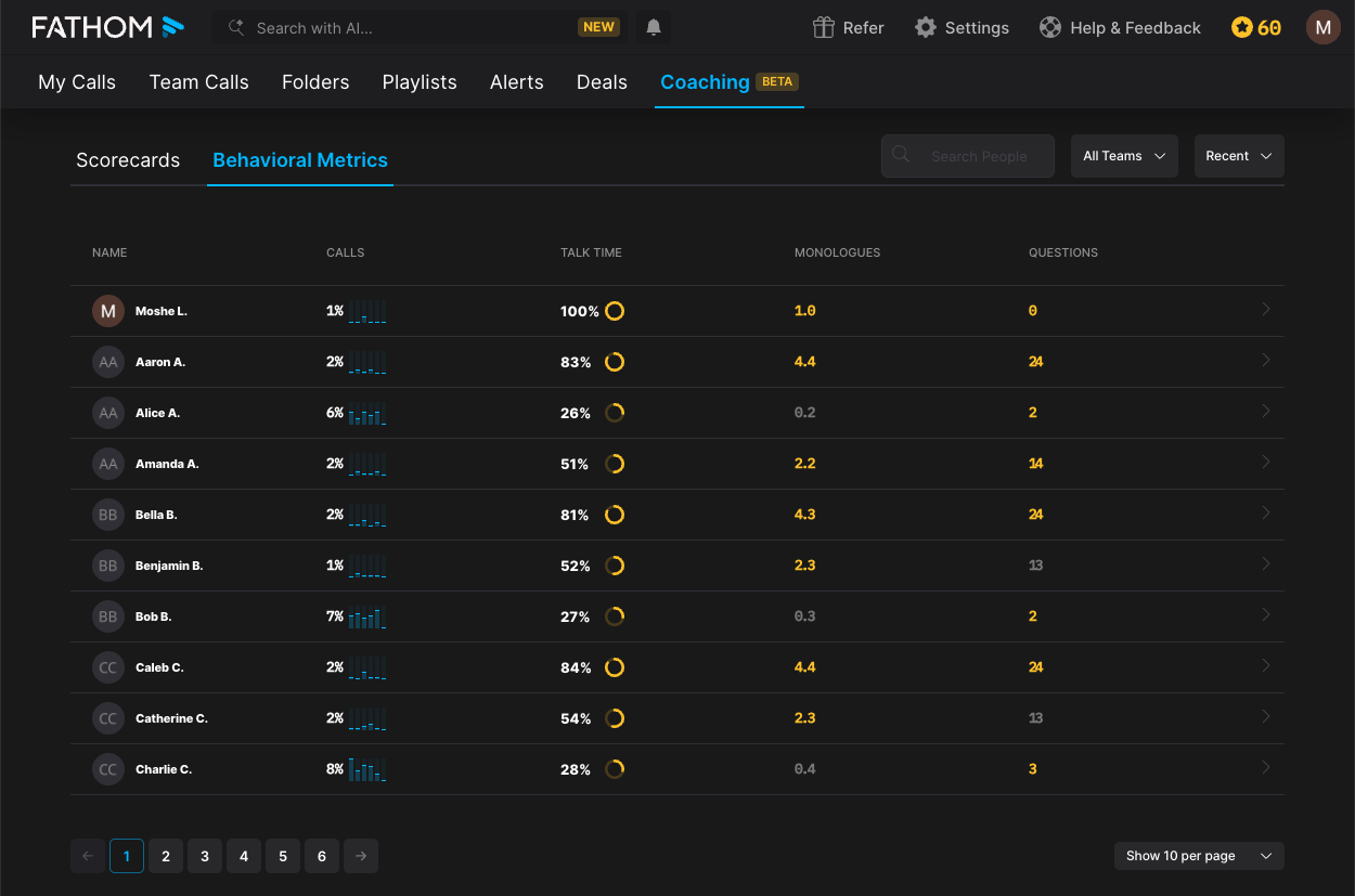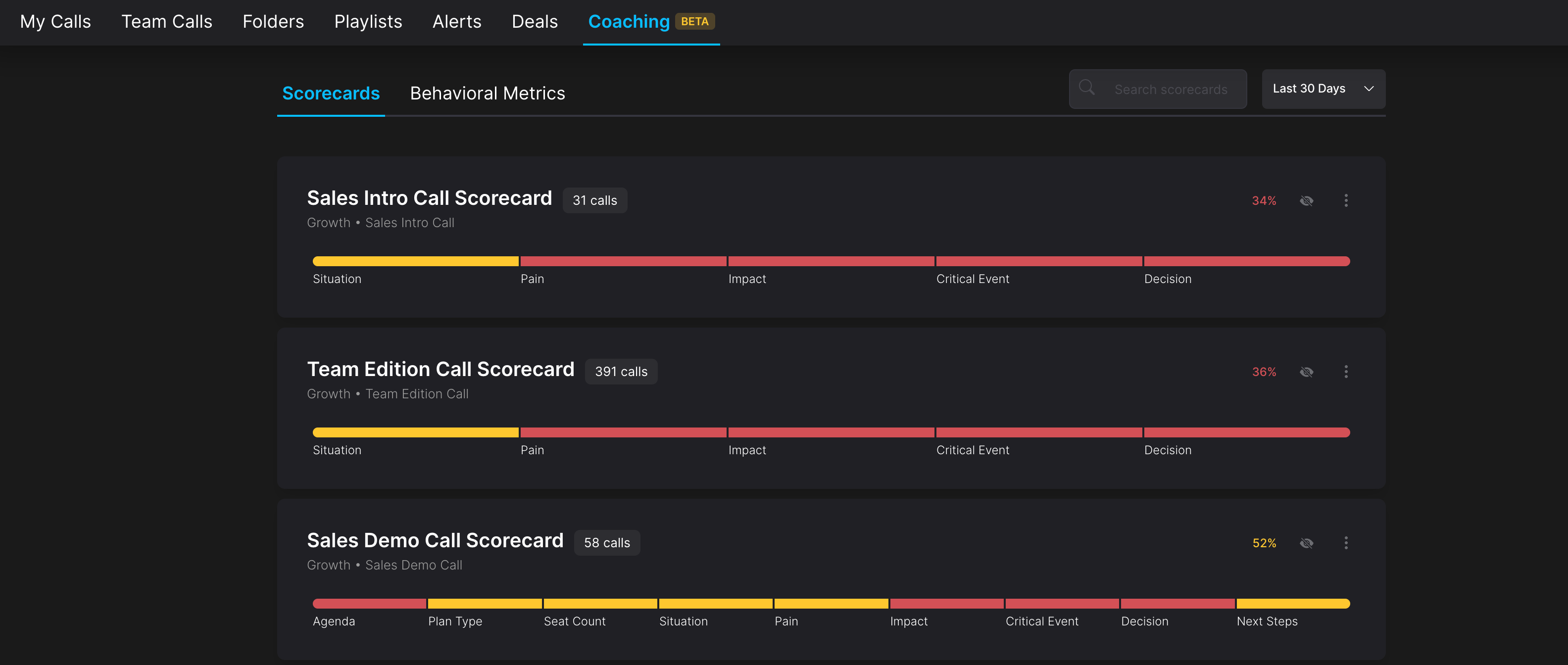 The Coaching tab gives you access to the metrics and insights that help you understand team performance during calls. It now includes both AI Scorecards (available on Business/ Pro plan only) and Behavioral Metrics (available on all Team and Business plans).