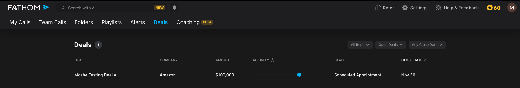 If Open Deals/Opportunities do not appear under the Team Calls tab, verify that Fathom is correctly integrated with your CRM.