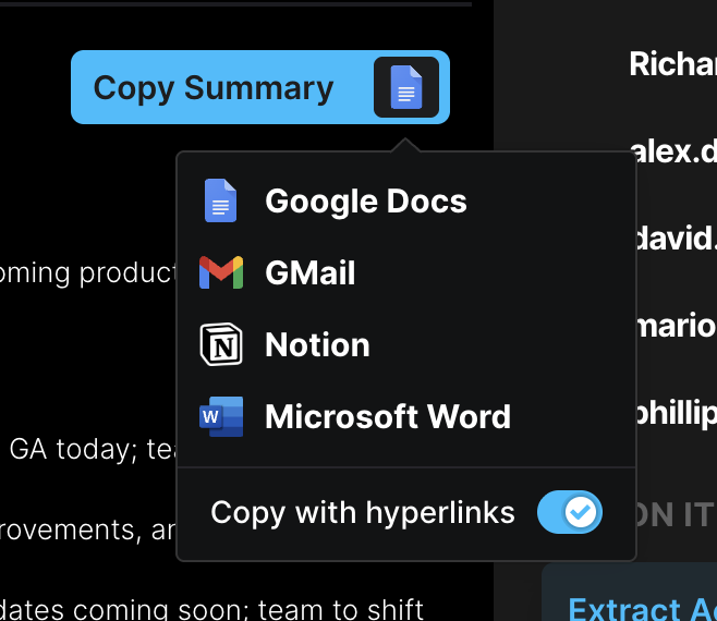 Copy with or without links - when copying a Summary to paste outside of Fathom, you can choose if you'd like it to include hyperlinks, or toggle them off: