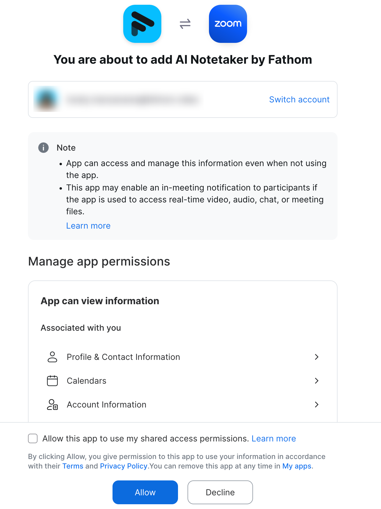 You’ll be asked to connect your Zoom account to Fathom and manage the app permissions. Make sure you’re signed in to your Zoom account for a seamless experience!
