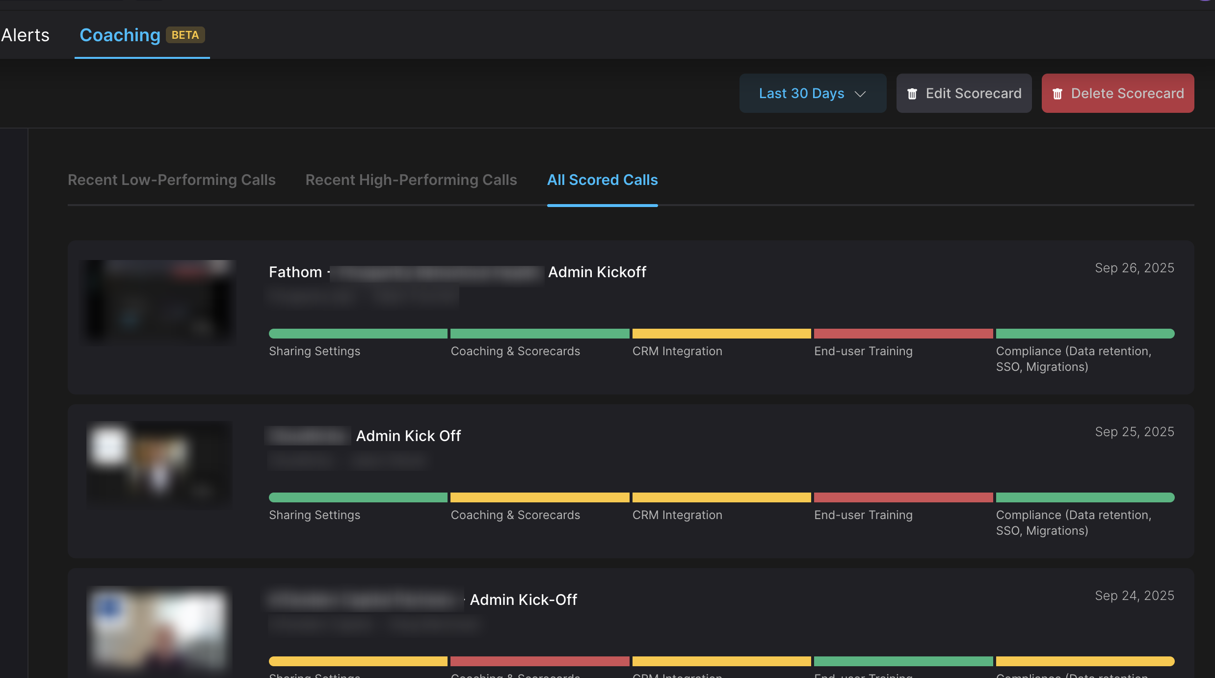 Fathom Team Admins now have access to the new Coaching tab. This tab serves as the central place to manage AI Scorecards and review aggregated coaching metrics.